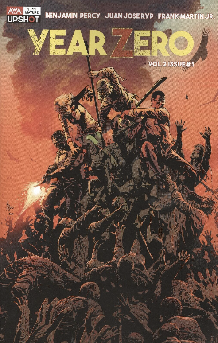Upshot's hit series Year Zero returns with four new harrowing tales of survival from around a post apocalyptic world: A grizzled Norwegian sea captain and her two young grandchildren navigate an ocean teeming with undead while eluding the relentless pirates on their trail. A Colombian cartel boss indulges all of his most sadistic whims unaware that a threat far greater than zombies is headed toward his jungle fortress. A Rwandan doctor must overcome the crippling fear that has plagued him all his life as he stumbles through the African bush. And a pregnant woman barricaded in an American big box store discovers that the greatest threat to her life - and her unborn child's - might not be undead. Benjamin Percy (Wolverine- X-Force) once again pens this global look at the zombie apocalypse- now joined by artist Juan Jose Ryp (Britannia) and colorist Frank Martin (Infinity Wars).